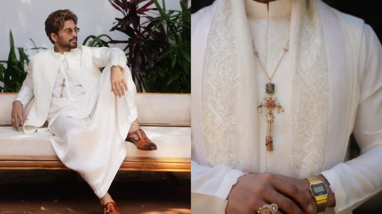 Actor Allu Arjun made a striking style statement at his brother Allu Sirish’s wedding celebrations, turning heads with traditional accessories including a payal, kundan ring, and meenakari pendant. His choice of jewelry blended heritage craftsmanship with contemporary flair, adding cultural richness to the star-studded family occasion.