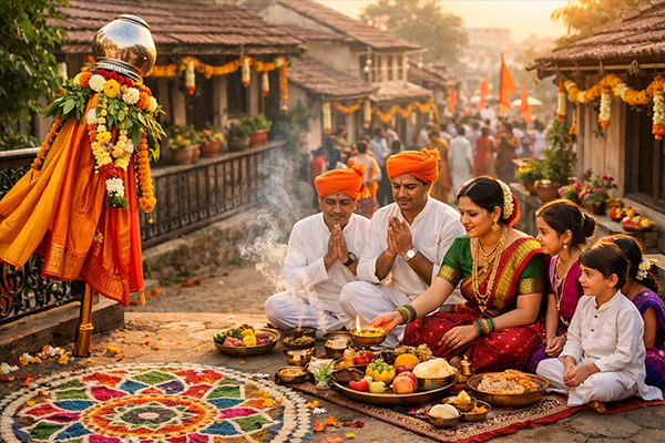 The festival symbolizes new beginnings, prosperity, and victory. Families in Maharashtra and Goa hoist the traditional “Gudi” outside their homes, decorated with a bright cloth, neem leaves, and garlands, topped with a kalash. It is believed to ward off evil, invite good fortune, and mark the arrival of spring.