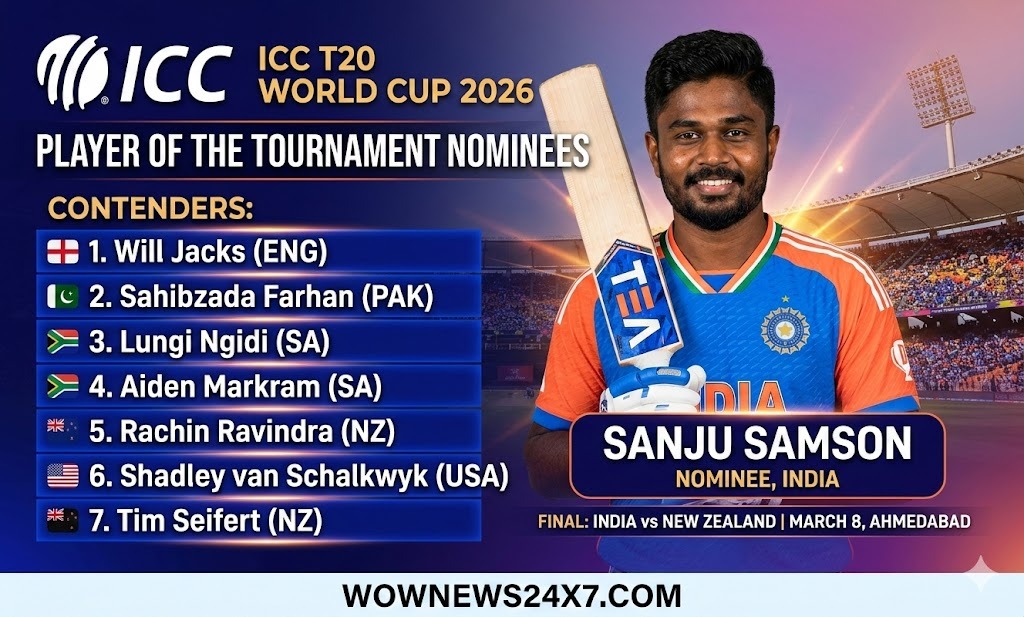 The ICC unveiled eight nominees for the T20 World Cup 2026 Player of the Tournament, including India’s Sanju Samson. Other contenders are Will Jacks, Sahibzada Farhan, Lungi Ngidi, Aiden Markram, Rachin Ravindra, Shadley van Schalkwyk, and Tim Seifert. The announcement precedes the India–New Zealand final in Ahmedabad on March 8.