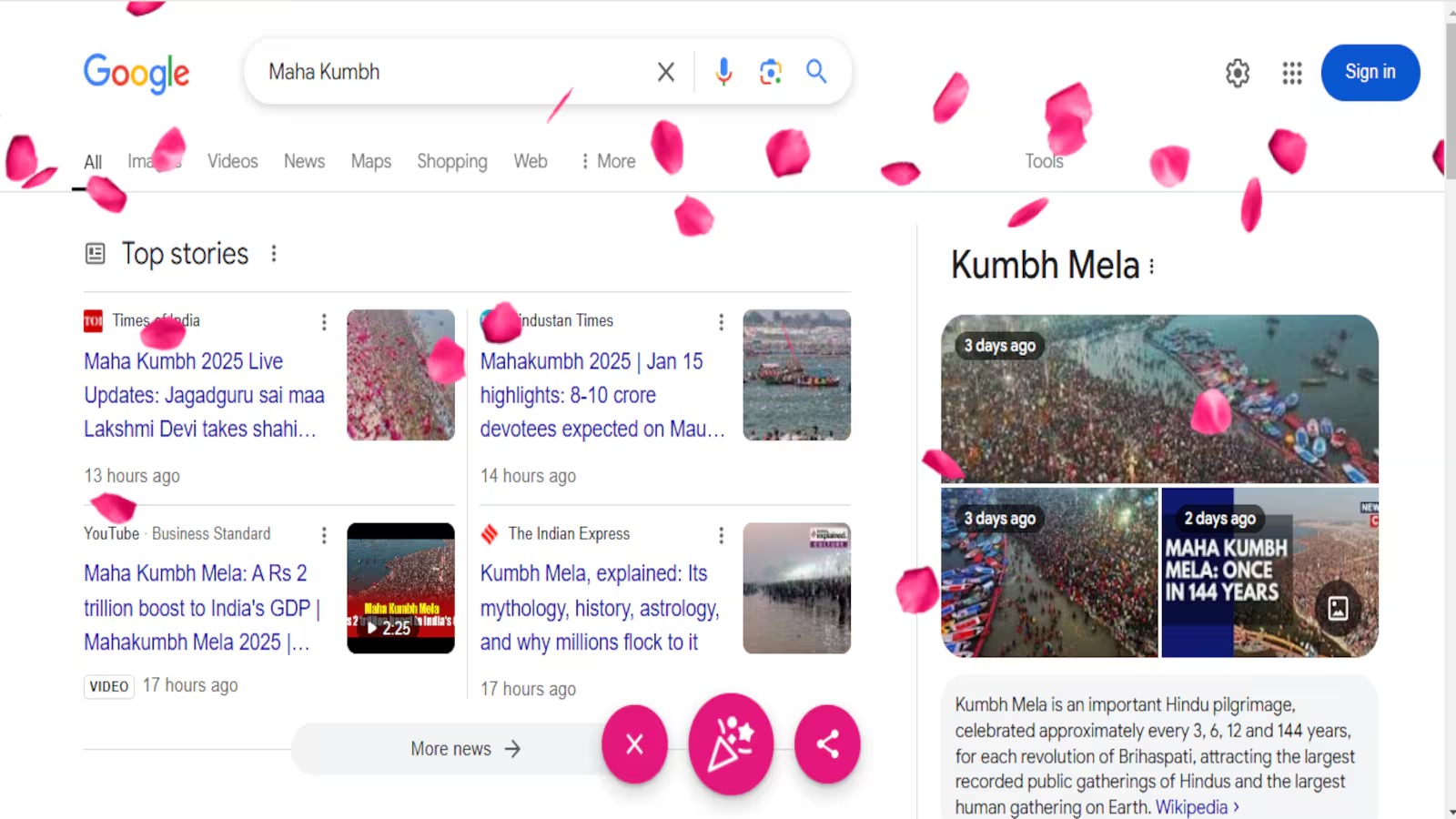 In a colorful tribute to the continuing Maha Kumbh Mela 2025, Google has come up with an eye-catching virtual rose petal animation on its search platform. On searching for words like "Kumbh" or "Maha Kumbh," the beautiful cascade of petals greets users, making this gigantic spiritual gathering even more festive. This interactive feature is a celebration of the event in itself and shares the experience of users through social media. Maha Kumbh, hosted at Prayagraj, will be attended by over 40 crore pilgrims till February 26, which also signifies the global appeal of the fair.