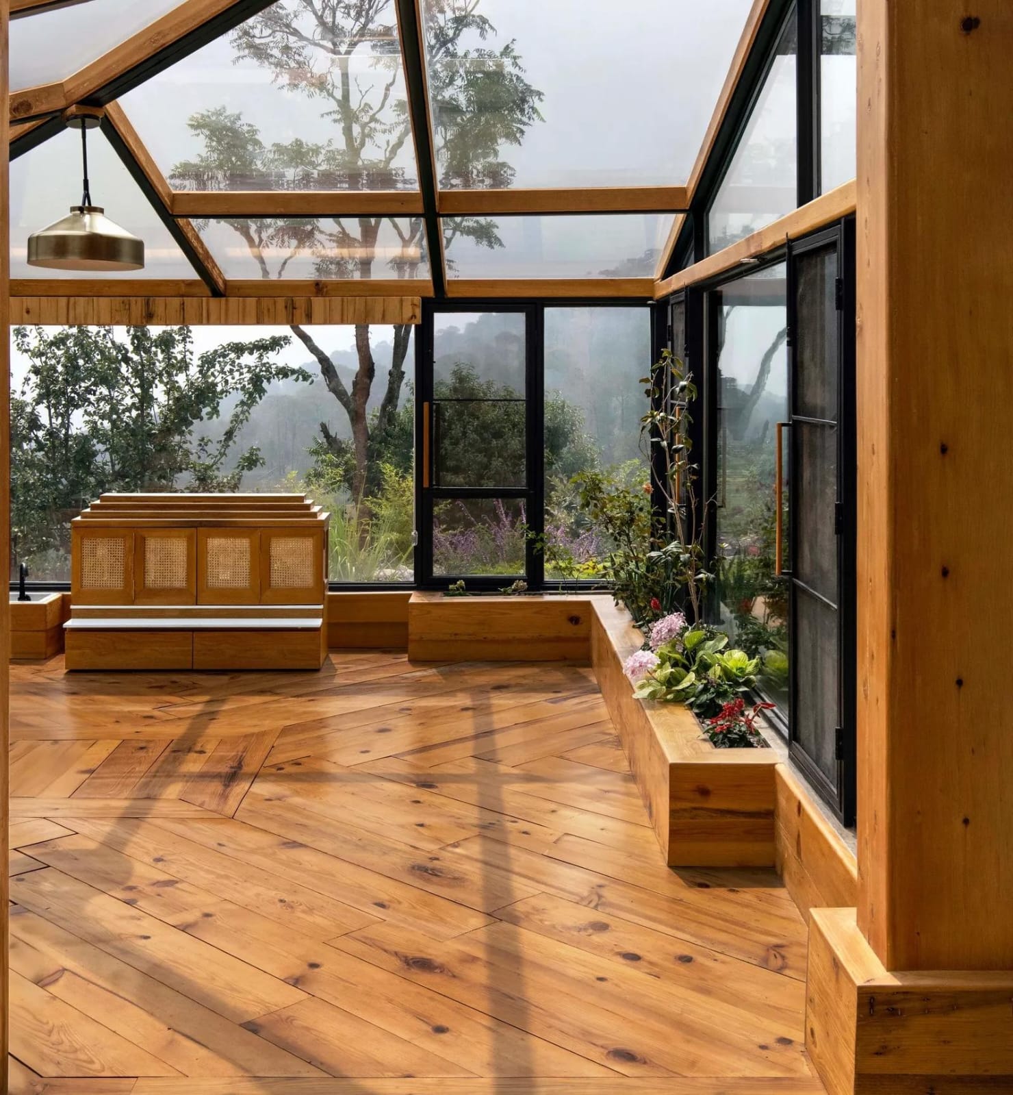 Fashion designer Rahul Mishra envisioned Aatman, a hill retreat rooted in Kumaoni architecture. A glass solarium with a handcrafted temple doubles as a meditation zone, where sunlight, silence, and reclaimed materials create a deeply spiritual atmosphere.