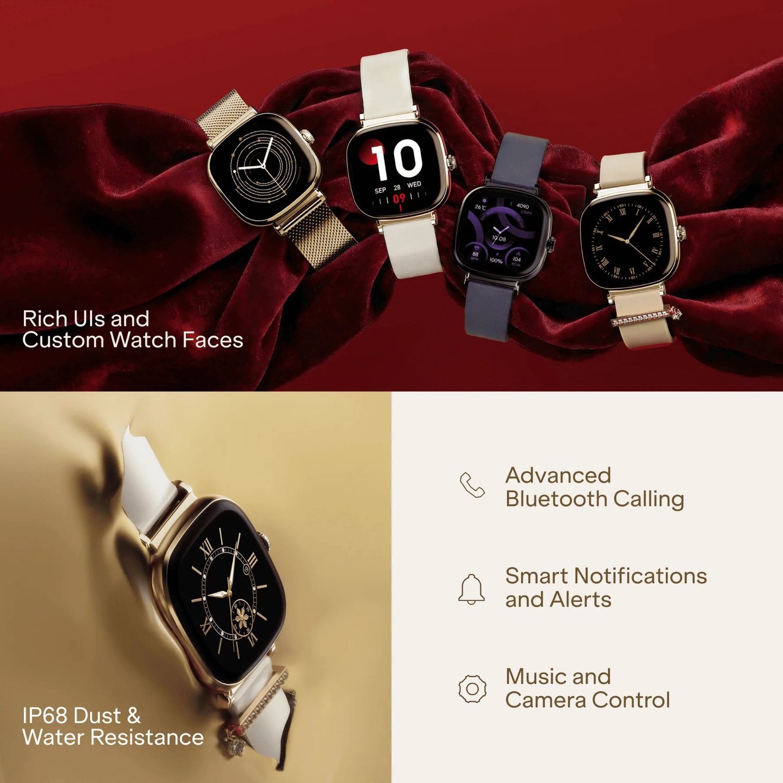 The smartwatch includes female wellness tracking, SpO2 measurement, heart rate monitoring, and sleep analysis. It also supports Bluetooth calling, notifications, and IP68 dust and water resistance, making it suitable for everyday use.