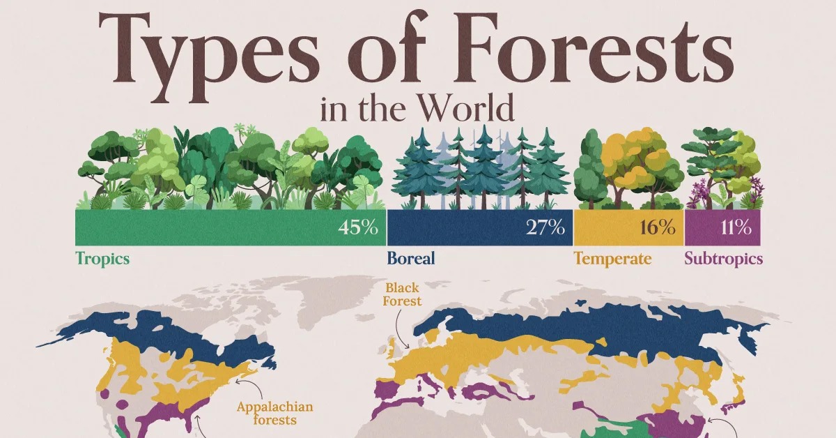 Forests cover nearly one-third of Earth’s land and are classified into four major types—tropical, temperate, boreal, and subtropical. Each type is defined by climate, geography, and biodiversity. Together, they store carbon, regulate climate, and sustain ecosystems, making their protection vital for humanity and the planet.