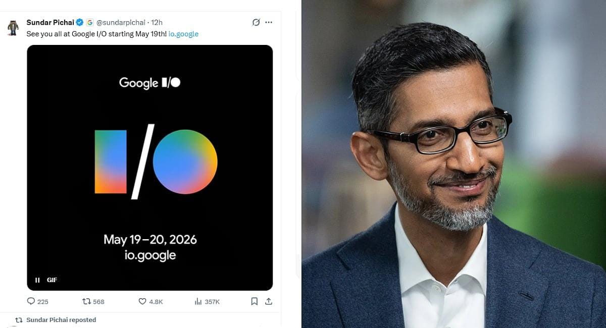 Sundar Pichai posts on X: "See you all at Google I/O starting May 19th! io.google" confirming dates