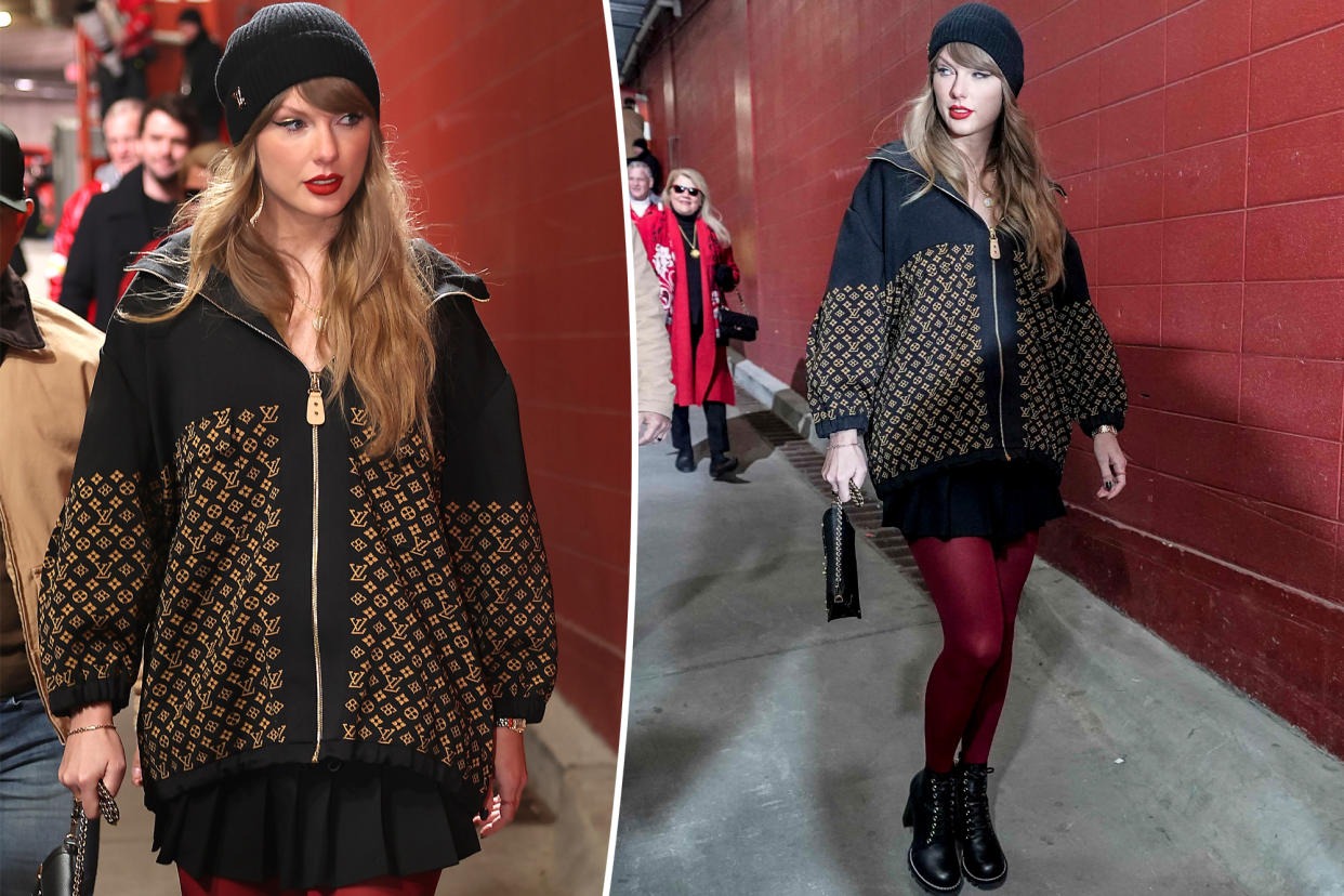 Taylor Swift turned heads at the AFC Championship game, donning an eye-catching Louis Vuitton ensemble worth ₹30.8 lakh to support her boyfriend, Travis Kelce, of the Kansas City Chiefs. The pop icon sported a luxurious black and gold Monogram Jacquard Knit Jacket, complemented by a matching beanie and a chic mini skirt. Her game-day look showcased not only her fashion prowess but also her unwavering support for Kelce as they faced off against the Buffalo Bills. Swift's appearance continues to make waves in both the fashion and sports worlds.