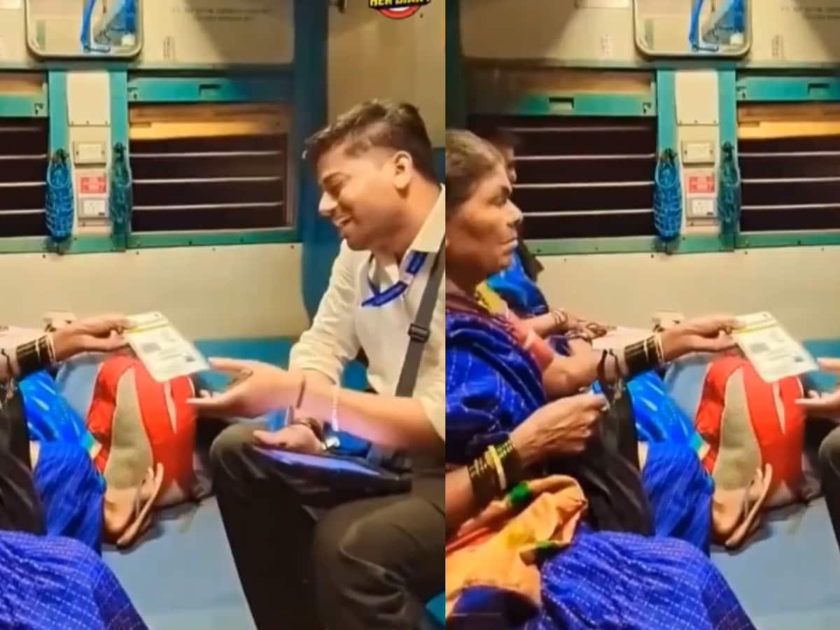 A viral video shows an elderly woman on an Indian Railways train mistakenly presenting her Aadhaar card instead of a ticket to the TTE. The heartwarming moment, captured on camera, highlights the TTE’s gentle and compassionate response, sparking praise across social media for his patience and kindness toward senior citizens.
